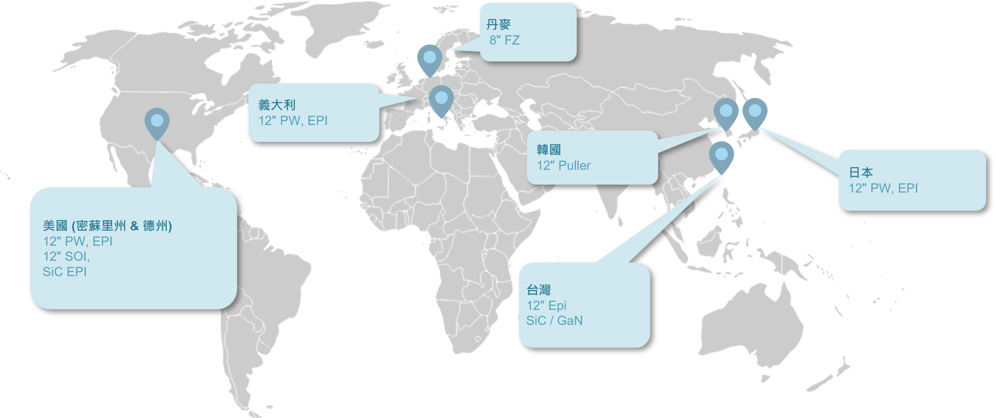 環球晶圓的營運據點橫跨 亞洲、歐洲與美洲 三大洲,共設有 18 座生產基地,遍佈 9 個國家,形成兼具在地化製造與全球支援的營運網絡。