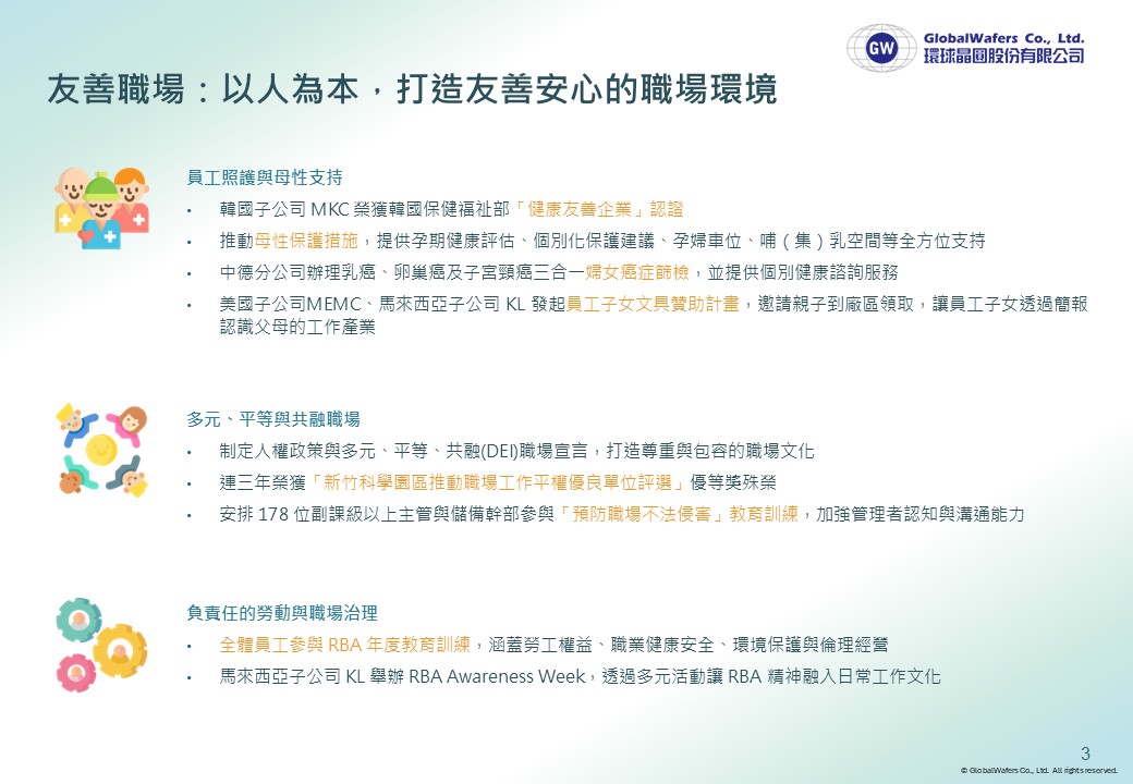 員工是環球晶圓成長及永續經營的重要因素,重視員工職涯發展及生活、工作的平衡。