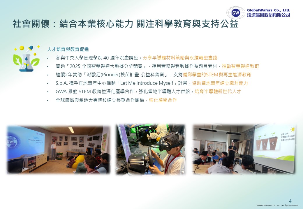 環球晶圓致力於運用尖端的領先技術,加速新製程和次世代新產品的開發能量,期能為投資人、客戶及員工創造更多價值。
