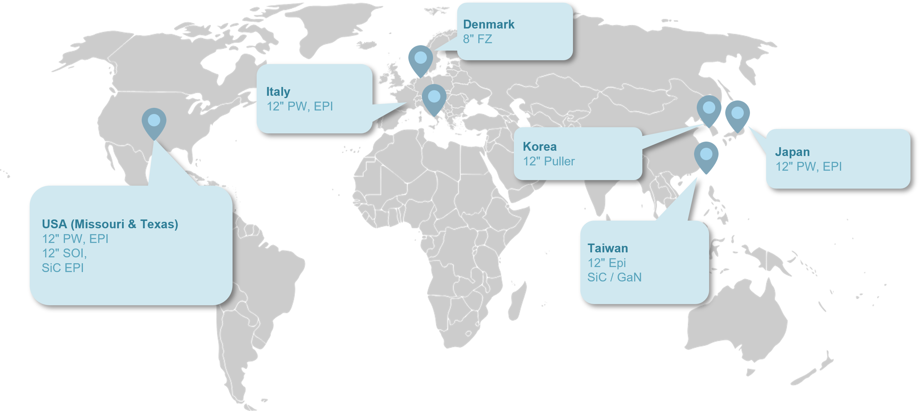 GlobalWafers operates across three continents — Asia, Europe, and the Americas — with 18 manufacturing sites in 9 countries, forming a globally integrated network that combines localized production with worldwide support.