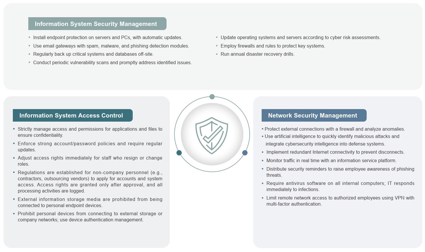 To integrate information security management policies and risk management into daily operations, the company also requires each subsidiary within the group to establish its own Information Security Task Force. Members of these task forces are representatives from various departments, who discuss and communicate information security matters relevant to their departmental operations during meetings. They are responsible for implementing the information security policies and practices set forth by the Information Security Committee.