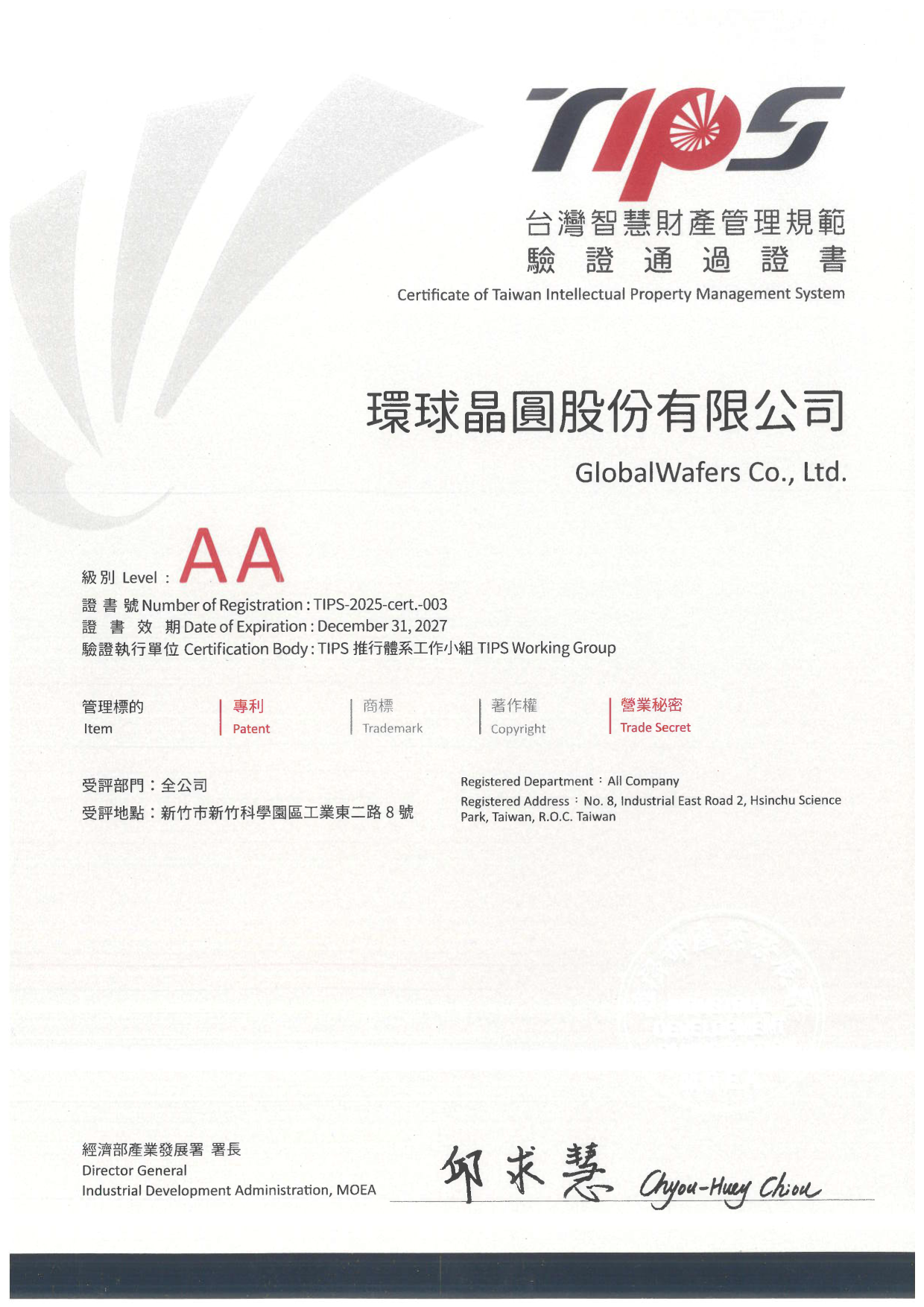 環球晶圓於 2013 年導入台灣智慧財產管理制度 (Taiwan Intellectual Property Management System, TIPS),依序建置管理流程且通過基礎驗證,持續於 2014、2015 年通過深入驗證,2016、2017、2019、2021、2023、2025 年連續六次通過 AA 級驗證。透過建置系統化管理強化與提升公司的智財管理能量,並且受到第三方的認證與肯定。
