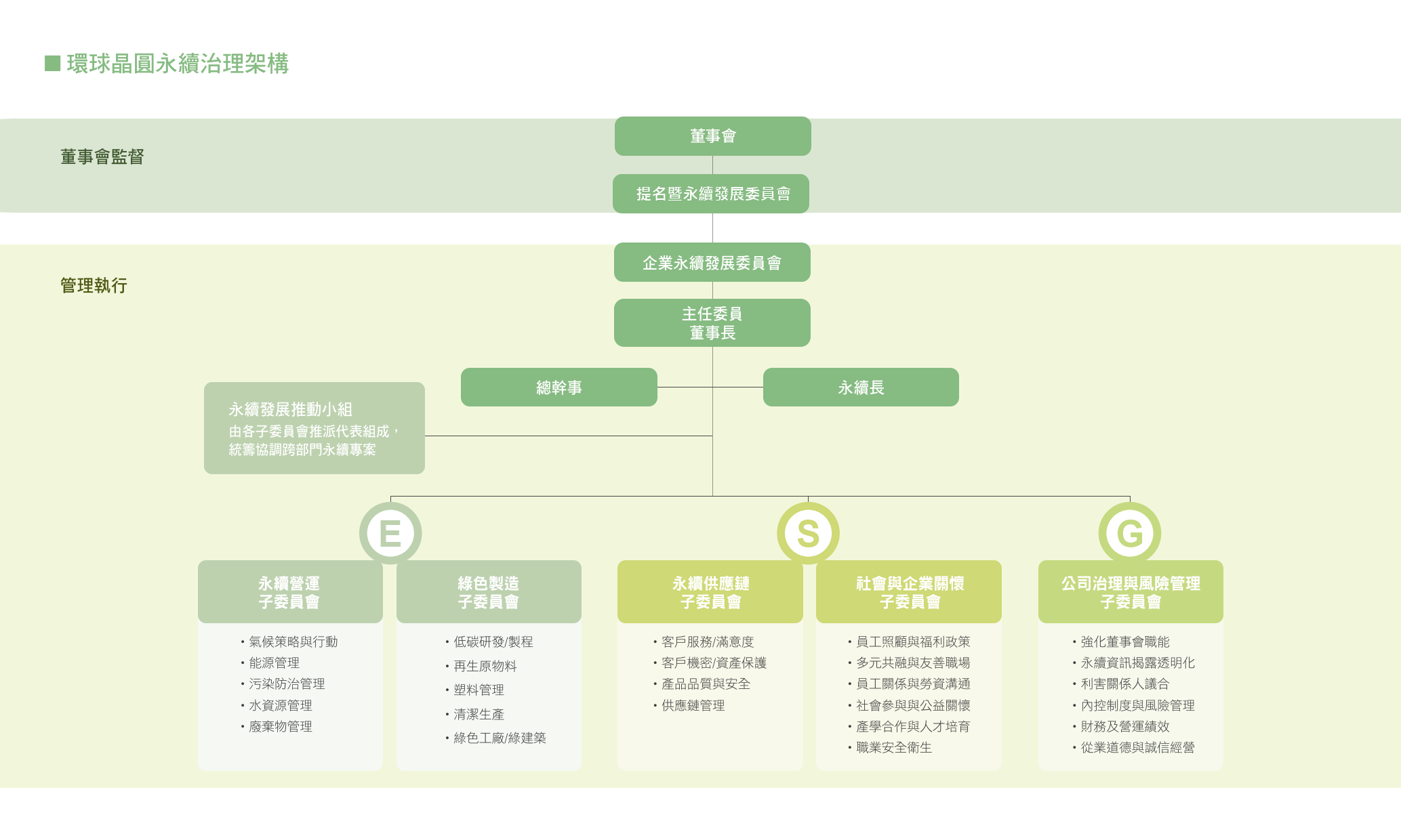 企業永續發展委員會由董事長擔任主任委員,財務長擔任總幹事,並依據業務功能設置五個子委員會,包括「永續營運子委員會」、「綠色製造子委員會」、「永續供應鏈子委員會」、「社會與企業關懷子委員會」、「公司治理與風險管理子委員會」,由各單位主管所組成,負責策略及管理方針之擬定,確保永續發展策略充份落實於公司日常營運中。「企業永續發展委員會」另設「永續發展推動小組」,擔任上下整合、橫向串聯的跨部門溝通平台,並且藉由定期舉辦工作會議,或依各項ESG專案而設之任務小組,就相關議題進行跨部門整合及執行推動,並定期追蹤執行成效及持續改善。企業永續發展委員會每年召開全員會議,針對本公司重大永續議題檢討當年度目標達成情形,並檢視短、中、長期目標之設定。