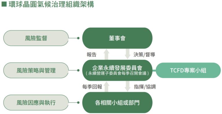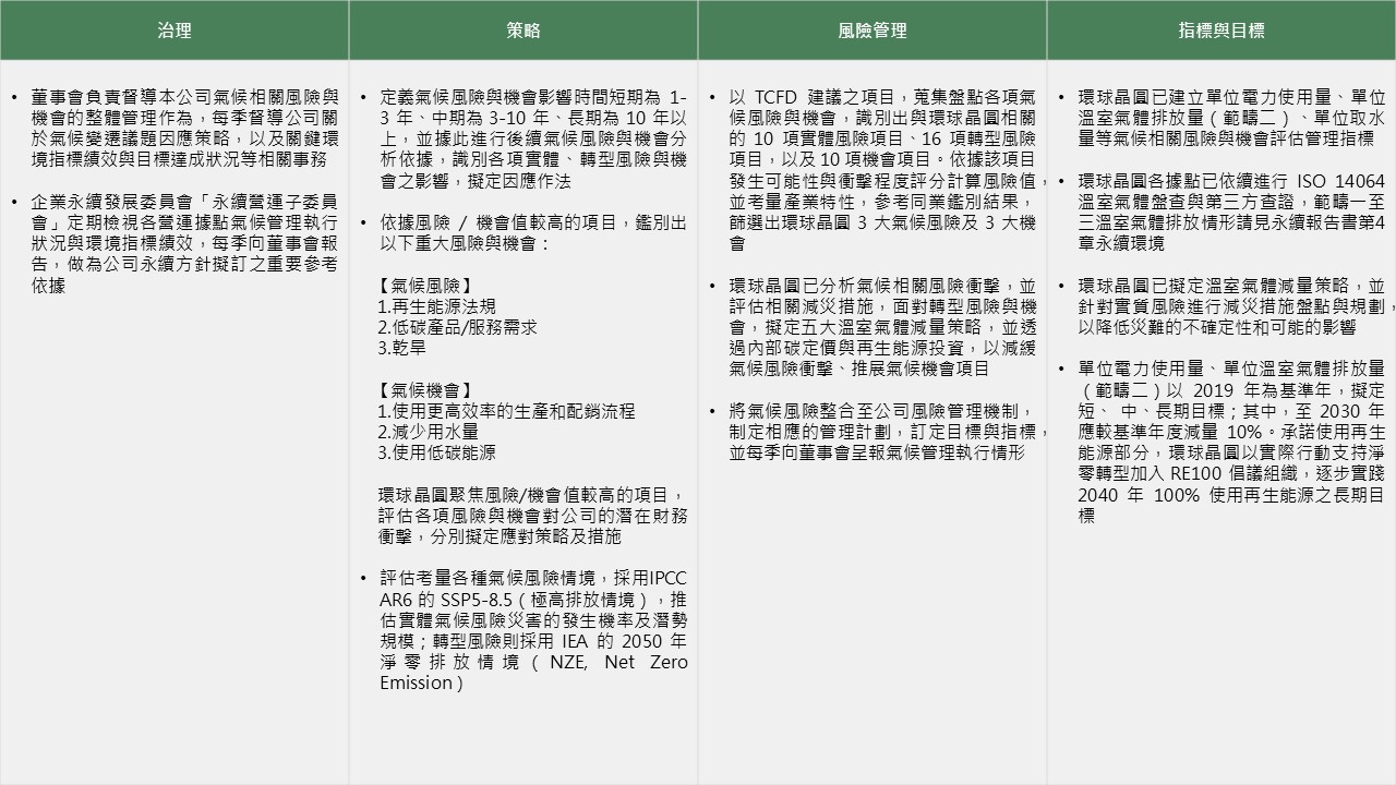 氣候變遷議題為聯合國、各國政府、社會與企業界目前最關注的環境議題之一。國際金融穩定委員會(Financial Stability Board, FSB)為協助公、私立部門建立相關資訊的揭露,成立了氣候相關財務資訊揭露專案工作小組(Task Force on Climate related Financial Disclosure, TCFD),並於 2017 年 6 月,提供了一個明確、可比較及一致性的資訊揭露建議指引文件。環球晶圓依據金管會「上市櫃公司永續發展路徑圖」、「上市櫃公司永續發展行動方案」之推動主軸,參考 TCFD 架構強化永續報告書揭露資訊內容,鑑別評估氣候變遷對於公司的風險與機會,每年檢視更新。依治理、策略、風險管理、指標與目標四大核心要素揭露氣候變遷相關資訊。