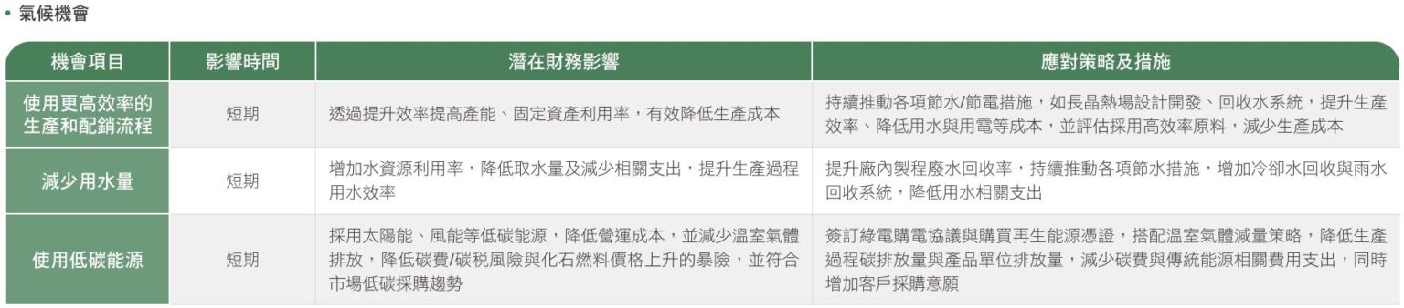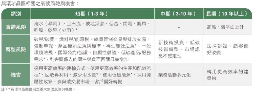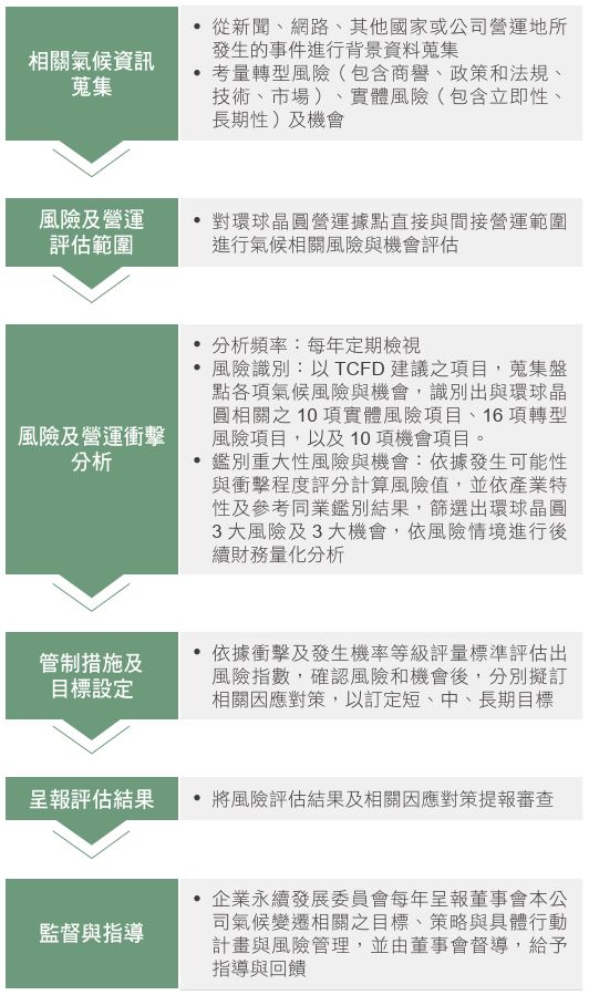 環球晶圓定義氣候風險與機會影響時間:短期為1-3年、中期為3-10年、長期為 10 年以上,蒐集相關氣候風險與機會,辨識出與環球晶圓相關的氣候風險與機會,並聚焦風險機會值較高的 3項氣候風險與 3項氣候機會,據以評估各項風險與機會對公司的潛在財務衝擊,分別擬定應對策略及措施。