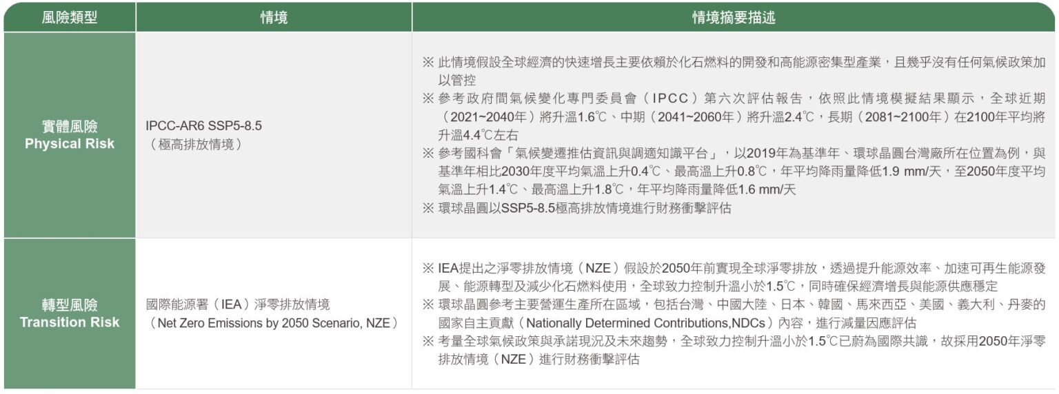 環球晶圓依據 TCFD 架構及參考國際能源總署(IEA)及聯合國政府間氣候變化專門委員會(IPCC)發布的最新科學評估報告,並結合外部顧問意見,經評估後採用下列氣候風險分析情境。